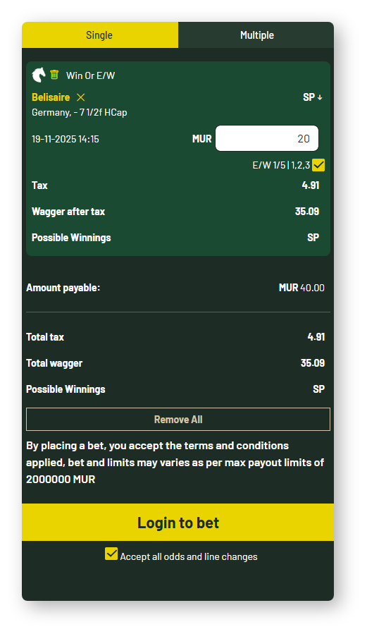 Easy access to Singles, Each-Way, Accumulators, and Special Bets